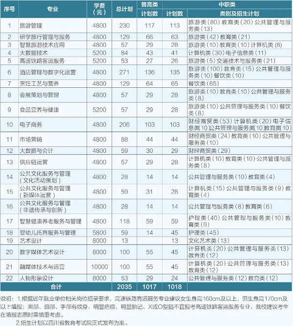 学校现有教职工536人,其中硕士及以上学位的教师327人(博士6人),具有高级专业技术职务的教师68人,“双师型”教师152人。学校面向行业企业遴选232名工匠作为行业导师,常态化进校授课。教师成功申报国省市科研课题450余项,在国省市比赛中获奖600余人次。学校依托四川省丰富的文化内涵和旅游资源,聚焦文化旅游产业,开设旅游管理、酒店管理与数字化运营、烹饪工艺与营养、电子商务、智慧健康养老服务与管理、数字媒体艺术设计等24个专业及方向,现有全日制在校学生1.1万人。