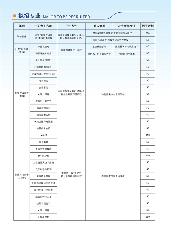 4.职教对口高考(三年制):升学考试成绩达到学校划定的最低录取控制线,按所报专业志愿,从高到低统一录取,录满即止。(其中幼儿保育专业、中医护理专业、护理专业、医学检验专业必须是具有重庆市户籍和学籍的初中应届毕业生,年龄在18周岁以下)。
