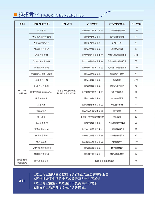 5.3+2、3+3升学全日制专科:升学考试成绩达到重庆市教委公布的最低录取控制线,按所报专业志愿,从高到低统一录取,录满即止。招生对象为具有我市三年完整初中学籍的2026届应届初中毕业生。(其中幼儿保育专业、中医护理专业、护理专业、医学检验专业必须是具有重庆市户籍和学籍的初中应届毕业生,年龄在18周岁以下)。