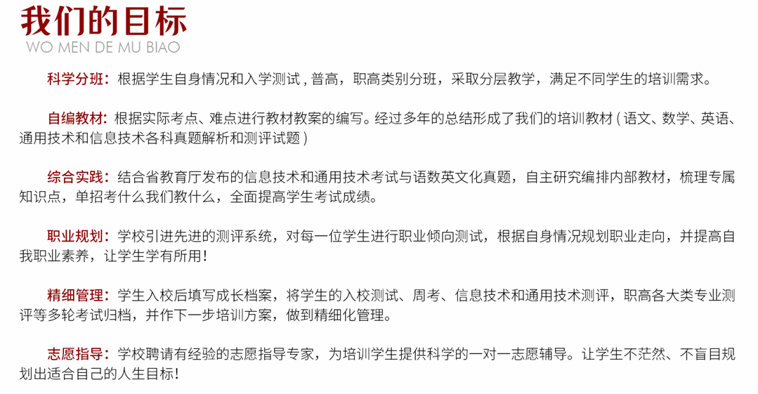学生入校后都会设定预期升学目标。拥有单招录取数据库,能帮助考生准确确定学校和专业。学生自然升学率超95%,综合升学率接近100%.
