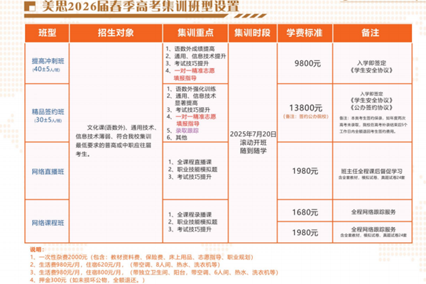 课程性质:“精品签约班” 是我校单招的核心课程之一,专为目标明确冲刺公办院校的学生设计。课程包含文化课(语文、数学、英语)、综合技能(通用技术、信息技术)、志愿填报指导等,并配备一对一辅导和心理支持。