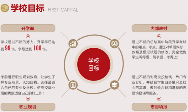 教学管理严格:学校严格执行人性化的全封闭式管理,集吃、住、学于一体,保护学生人身安全,保障学生身心健康,确保学生学习高效。建立了完善的测评、管理、服务体系,通过多轮测试和实践经验模式,确保学生全面掌握各类考试要求和技巧。同时实行定制化教学,根据实际考点、难点编写教材,即使是基础薄弱的学生也能学懂;每周末定期周考,每月定期月考,分数记录档案,学生成长看得见。并且采用分层式辅导,全天文化课正课轮流教学,全职教师在校与学生共同成长,晚自习任课老师一对一单独辅导,让每位学生都能快速吸收知识。